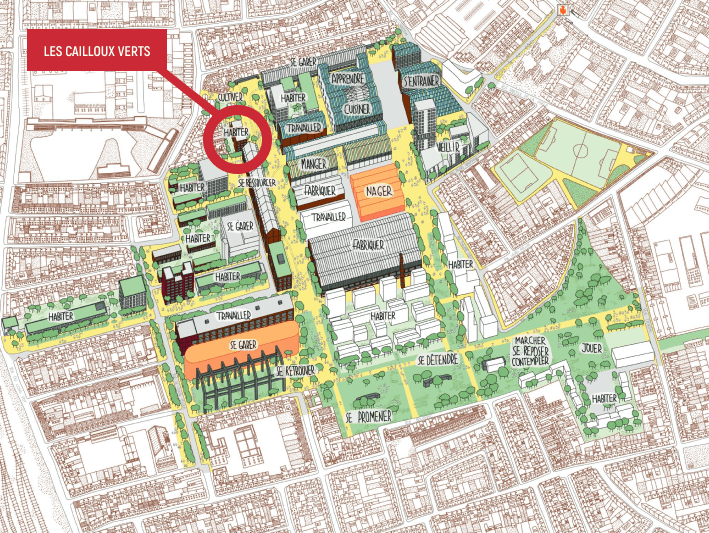 Pour redonner vie à cette friche de 25 hectares sur laquelle se dresse de monumentales halles d’acier, la Métropole européenne de Lille a confié en 2011 un programme de rénovation urbaine à la Soreli (Société anonyme d’économie mixte de rénovation et de restauration de Lille), sous la forme d’un éco-quartier, devant mettre en valeur le patrimoine des anciennes usines. Le bâtiment des Cail’loux Verts s’inscrit dans ce programme.